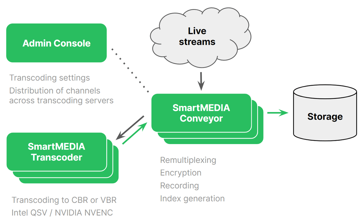 - Transcoder service can be shared between multiple *Conveyor *services, and vice versa. So you can build an optimal system configuration and, as a result, save on CAPEX & OPEX.